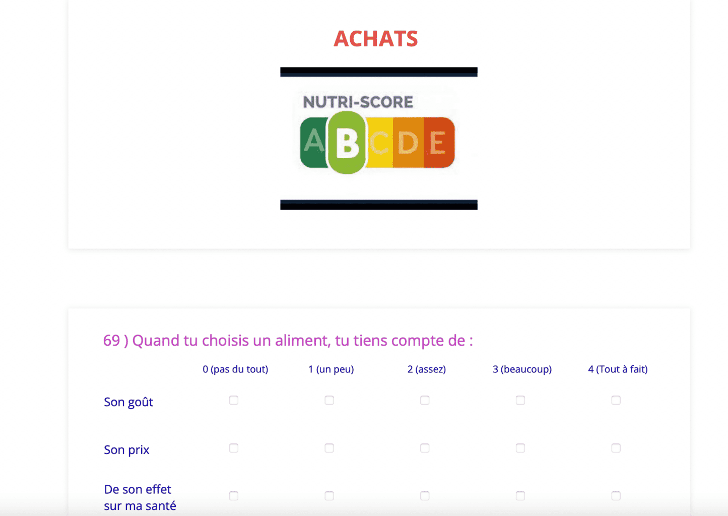 Élaboré avec l’aide de Caroline Méjean, directrice de recherche à l’INRAE, MOISA de Montpellier, ce questionnaire aborde différentes thématiques : consommation et rythme alimentaire, rythme de vie, activités sportives, achats et perceptions.